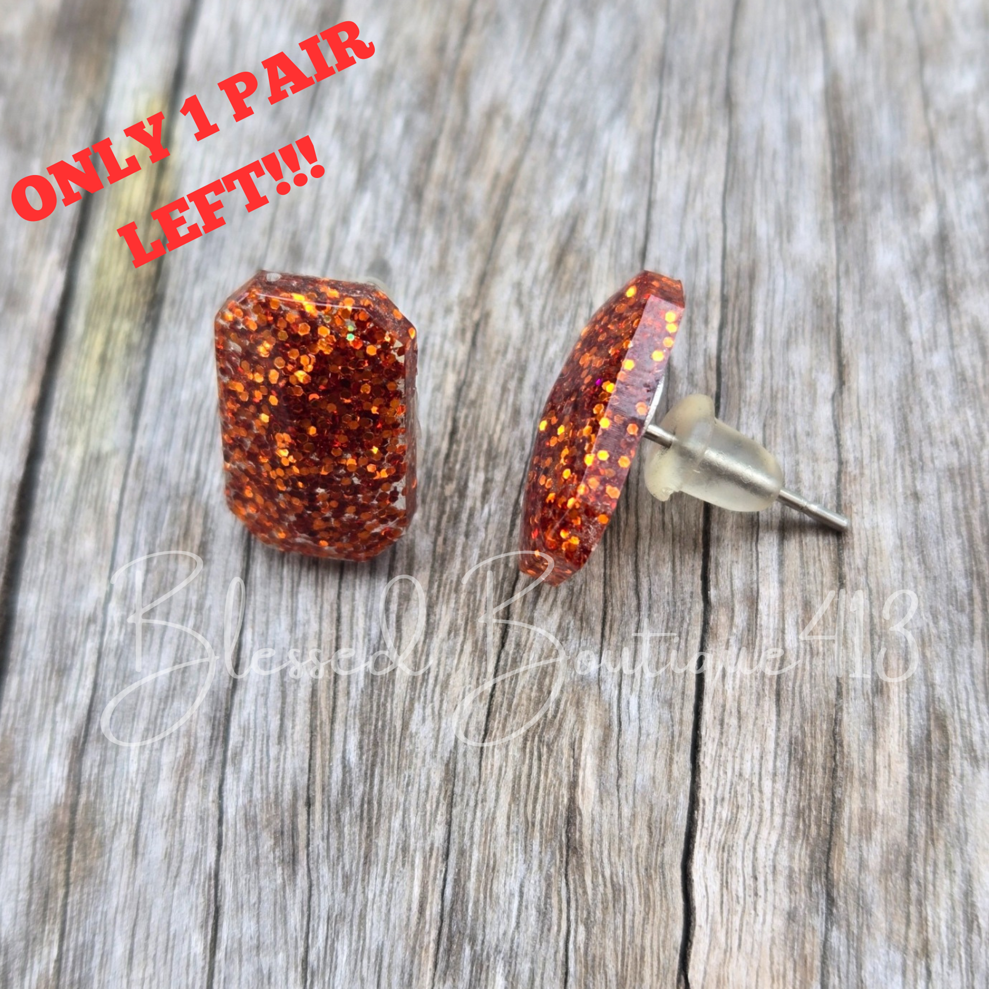 Cozy up to fall with our Autumn Ember Studs. These stunning emerald-shaped resin earrings are packed with rich, dark orange glitter that glows like a crackling bonfire on a crisp autumn night. Perfect for adding a touch of seasonal sparkle, they're bold enough to stand out but simple enough for everyday wear.