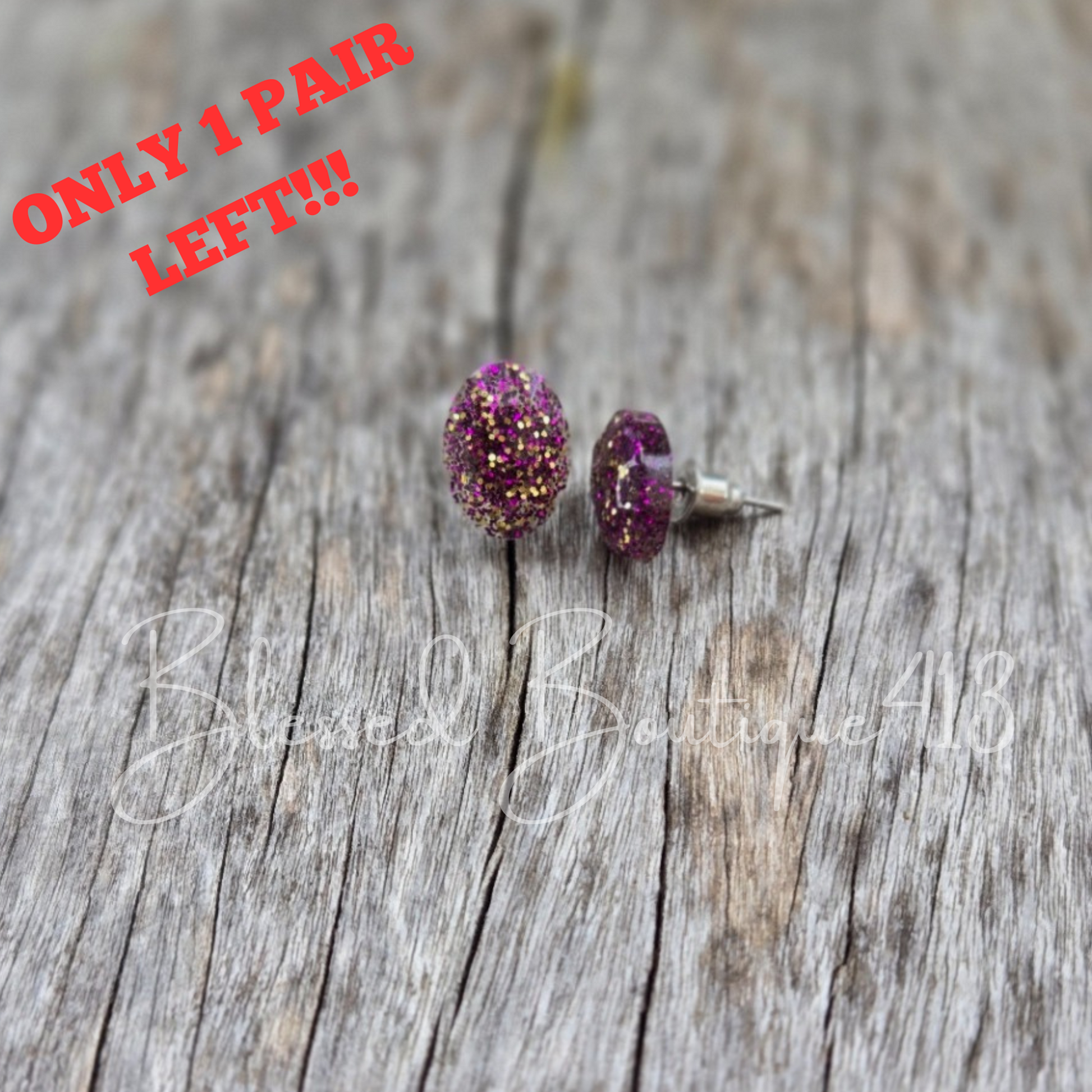 Bring a little Louisiana royalty to your look with our Bayou Royal Studs! These oval-shaped resin earrings shine with deep LSU purple and golden flecks, giving off the perfect mix of southern charm and Tiger pride. The elegant oval shape adds a classic touch, while the glitter brings bold, game day-ready sparkle.