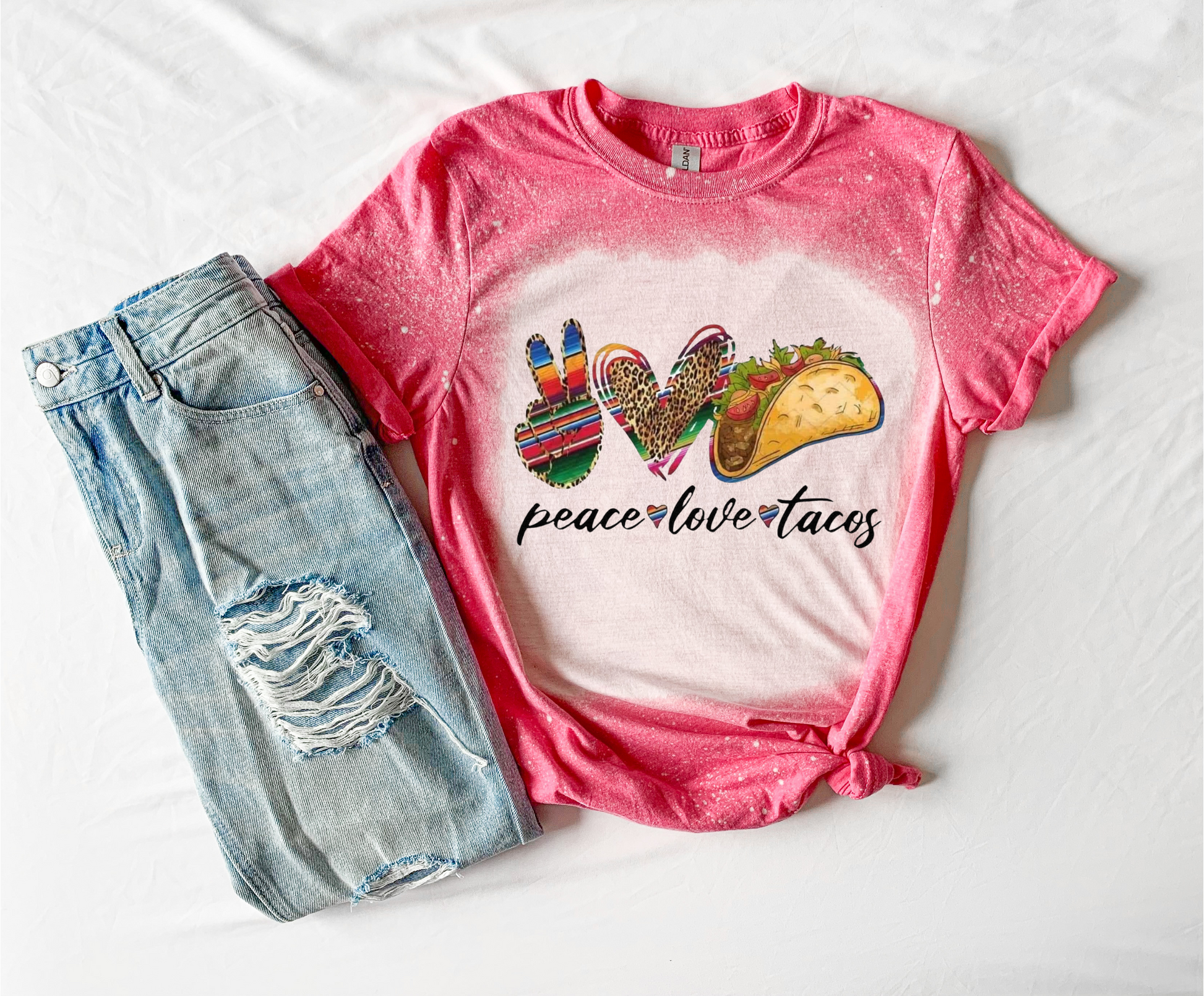 Spread the love (and tacos) with this quirky shirt. Show off your love for peace, love, and everyone's favorite Mexican dish. Perfect for any casual outing or taco Tuesday!